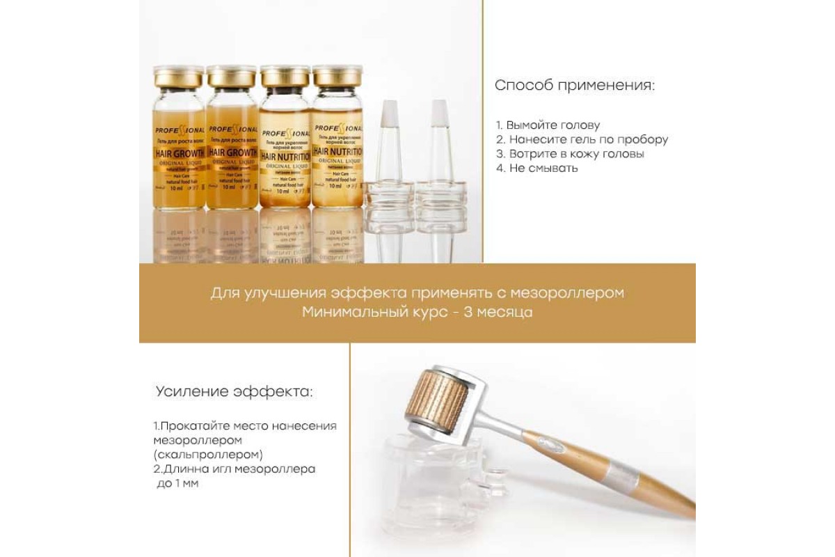 Необходимо нанести гель на корни волос и мягко вбить его в кожу головы массажными движениями на 5-10 минут. Эту процедуру рекомендуется повторять 2-3 раза в неделю. Данную процедуру можно проводить 2-3 раза в неделю. Для более глубокого проникновения компонентов геля, после его нанесения, кожу головы обработайте Дермароллером (Мезороллером) с микроиглами от 0,5мм до 1мм.